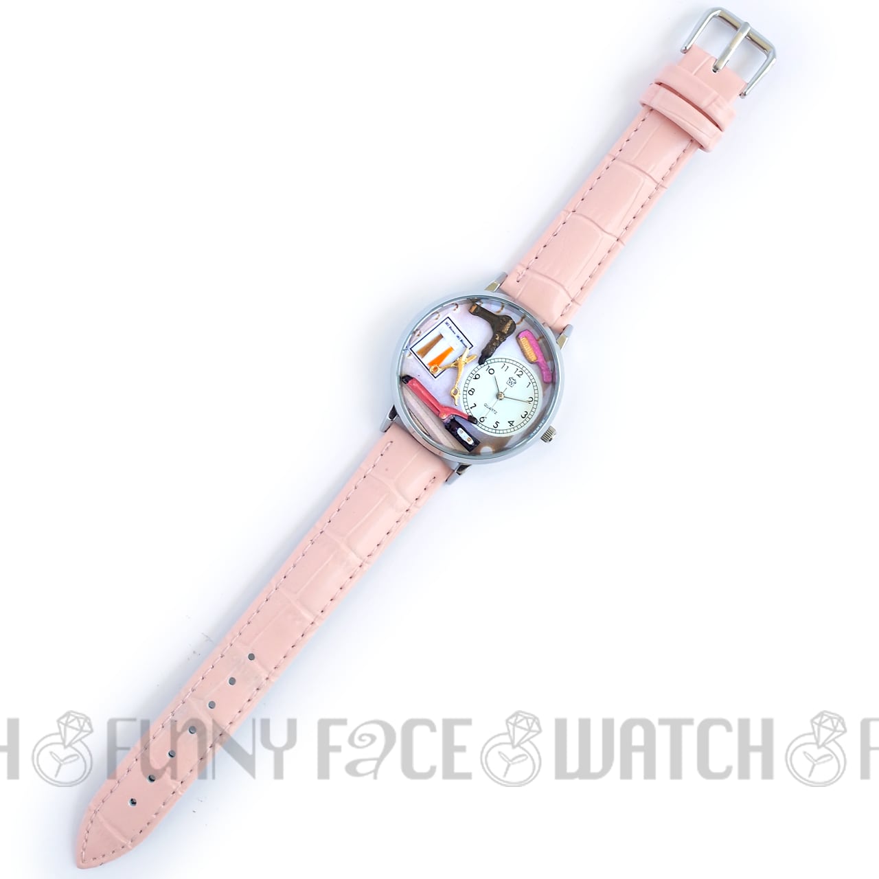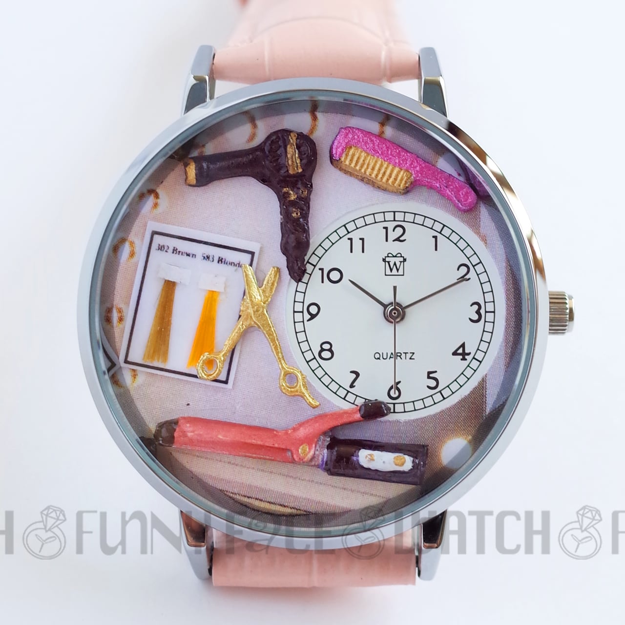 ヘアドレッサーをテーマにした魅力的な腕時計です。文字盤にはミニチュアの美容器具や美容師の必需品が描かれ、ヘアドライヤー、はさみ、ヘアアイロン、ヘアカラー、ヘアブラシまでもが細かなディテールで表現されています。美容業界に情熱を注ぐ方や、ヘアメイクを楽しむ方にとって、特別なインスピレーションを与えるアイテムです!